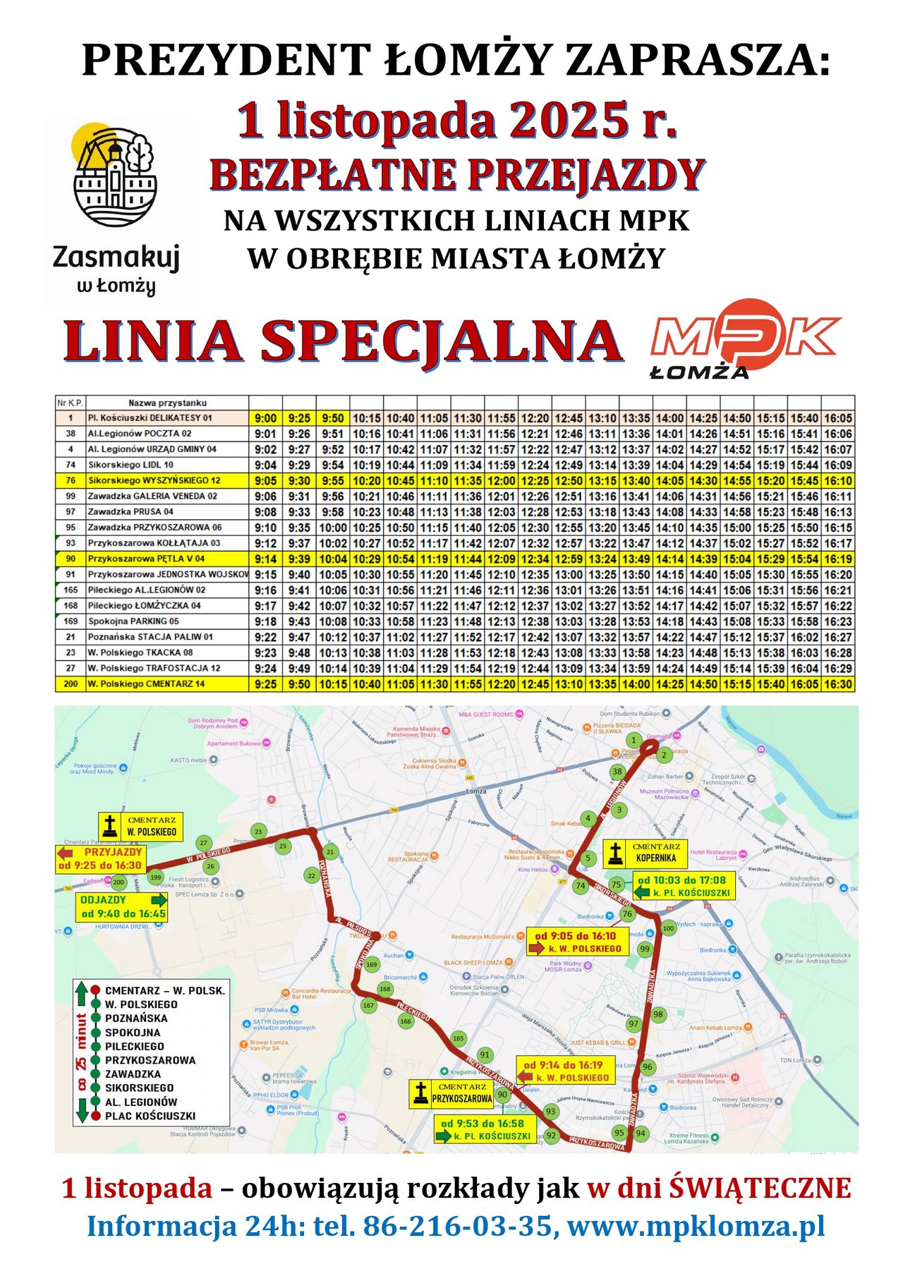 Decyzją Prezydenta Łomży Mariusza Chrzanowskiego, w dniu 1 listopada 2025 r. (Wszystkich Świętych) wszyscy pasażerowie będą mogli bezpłatnie korzystać z komunikacji miejskiej na liniach kursujących w obrębie Miasta Łomży. W tym dniu uruchomiona zostanie również specjalna linia autobusowa, mająca na celu zapewnienie dogodnego dojazdu do cmentarzy zlokalizowanych przy ulicach Wojska Polskiego, Kopernika oraz Przykoszarowej. Autobusy tej linii będą kursować co 25 minut, umożliwiając sprawne przemieszczanie się pomiędzy cmentarzami a głównymi punktami komunikacyjnymi miasta.