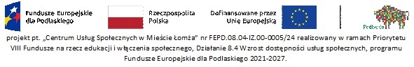 Miasto Łomża w okresie od 1 stycznia 2025 r. do 30 kwietnia 2028 roku realizuje projekt pn. „Centrum Usług Społecznych w Mieście Łomża” o nr FEPD.08.04-IZ.00-0005/24. Jego celem głównym jest integracja i optymalizacja świadczenia usług społecznych na poziomie lokalnym odpowiadających na zdiagnozowane potrzeby mieszkańców miasta Łomży. Rekrutacja do projektu rozpoczyna się w październiku 2025 r.