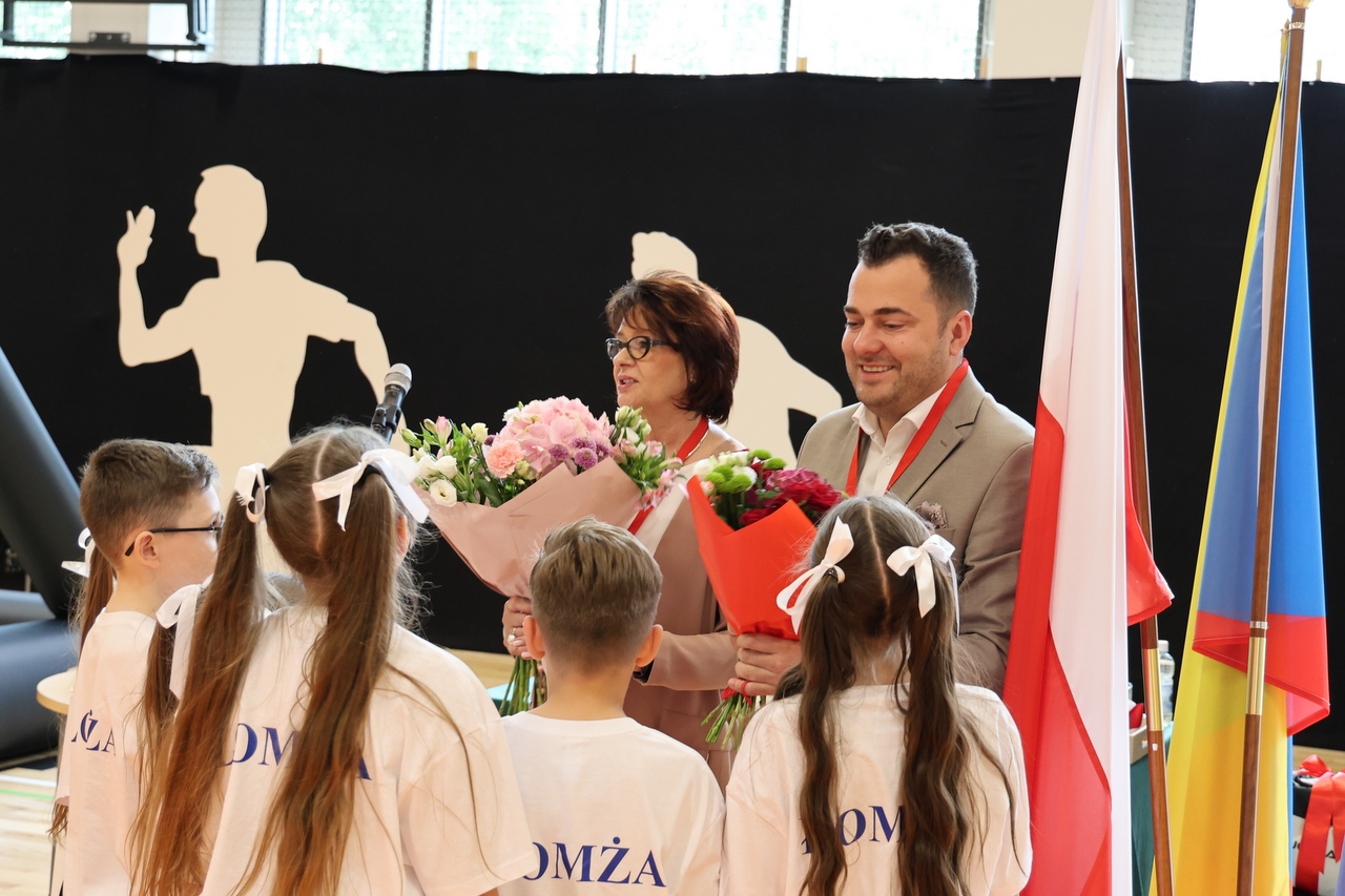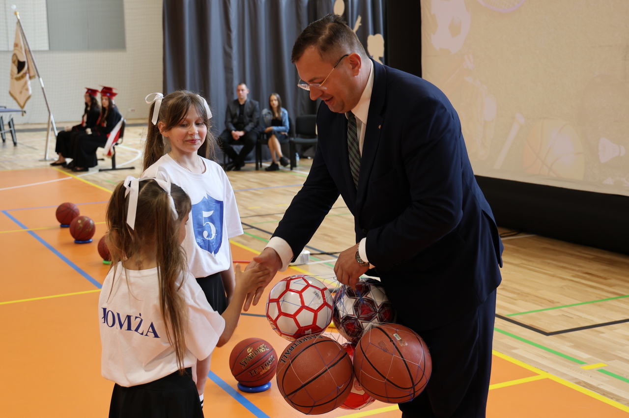 – Rozpoczynając inwestycję nie mieliśmy zapewnionego wsparcia zewnętrznego. Pomimo krytyki części radnych uważałem, że należy podjąć ryzyko i w trakcie realizacji zadania poszukiwać możliwości zewnętrznego dofinansowania. Dziś możemy powiedzieć, że to się opłaciło, gdyż z własnego budżetu dołożyliśmy tylko 19 proc. wartości przedsięwzięcia, a dzieci oraz młodzież z „Piątki” i całego miasta mogą cieszyć się z nowoczesnego obiektu sportowego – podkreślił prezydent Łomży Mariusz Chrzanowski, który przekazał samorządowi uczniowskiemu worek z piłkami do halówki, koszykówki i siatkówki, a dyrekcji pamiątkowy obraz.