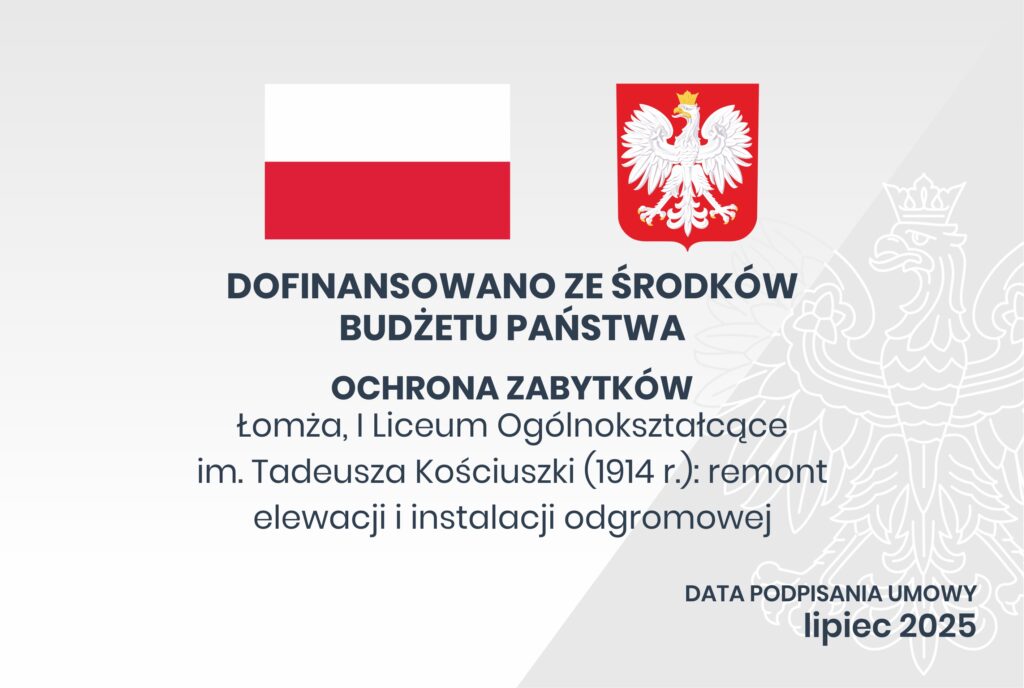 Nazwa zadania: Łomża, I Liceum Ogólnokształcące im. Tadeusza Kościuszki (1914 r.): remont elewacji i instalacji odgromowej