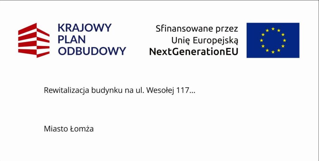 Przedmiot Projektu: Rewitalizacja ze zmianą sposobu użytkowania budynku hotelowego z częścią mieszkalną wielorodzinną na budynek mieszkalny wielorodzinny wraz z urządzeniami infrastruktury nadziemnej i podziemnej (zewnętrzna instalacja oświetlenia terenu, zewnętrzna instalacja kanalizacji deszczowej wraz z osadnikiem substancji ropopochodnych) oraz zagospodarowaniem terenu (droga pożarowa, dojazdy, dojścia, miejsca postojowe, wiata śmietnikowa, platforma dla osób niepełnosprawnych, brama ogrodzeniowa) na terenie położonym przy ul. Wesołej w Łomży obejmującym działki nr 21242/11, 21242/9 oraz część działki 21240/2. Powstałe lokale zostaną włączone do mieszkaniowego zasobu miasta Łomża.