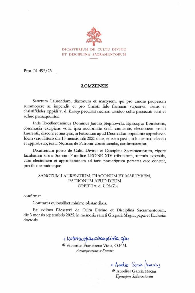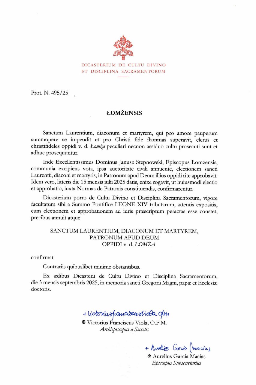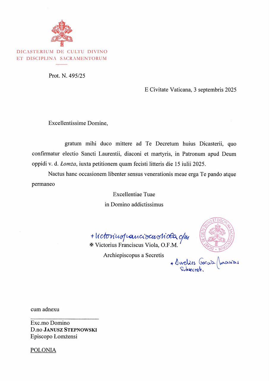 To bardzo ważna i symboliczna wiadomość dla naszego miasta. Święty Wawrzyniec, diakon i męczennik, został oficjalnie zatwierdzony przez Dykasterię Kultu Bożego i Dyscypliny Sakramentów jako patron przed Bogiem Miasta Łomża. Uroczystości z tym związane planowane są na początku przyszłego roku.
